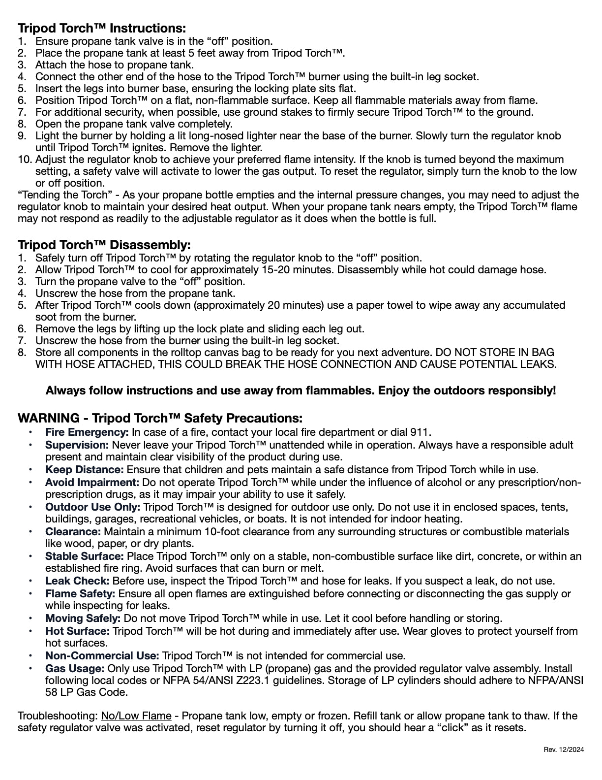 Attach the hose to your propane tank then attach the hose to Tripod Torch™ using the convenient built in socket located on each leg. Insert each leg into the base of the burner, making sure the locking plate sits flat and secures each leg. Place Tripod Torch™ on a solid surface and splay out each leg. For even more security, the T on each leg doubles as a stake point to fully secure Tripod Torch™ to the ground. Tripod Torch™ is quick and easy to setup so you can focus on making the most of your outdoor experience.